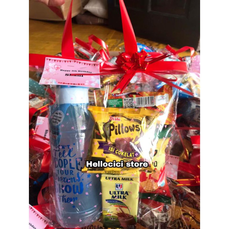 parcel kemasam ultah1 pcs botol minum takuma 1 pcs chiki chetos 1 pcs susu ultra1 pcs chocho chips 1 pcs pillow 1 pcs mieshoer/stik 1 pcs plastik + card name mohon untuk order dus yaaa demi keamanaan paket 1 dus isi 20