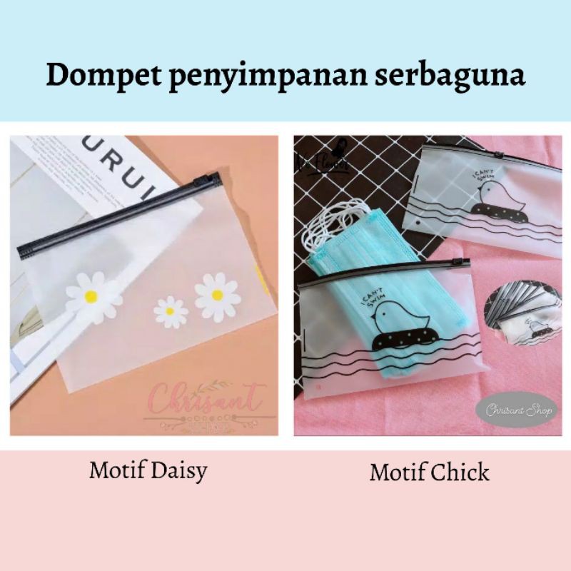 Pouch/Dompet Zipper SerbagynaRp. 6.000/pcbeli 5 pcs: 25.000 (1motif)Variasi : Daisy ChickUkuran : 20 x 13.5 cmBerat : 21 gramFungsi : multifungsi (tempat make up, masker, pulpen, mini notebook, notebook A5, Sticky notes, kaos kaki, sticker, uang, dan lain lain)-untuk masker bisa muat kurang lebih 10pcs-#pouch #pouchbag #poucha5 #kotakmasker #pouches #pouchmurah #pouchmakeup #pouchtransparant #pouchtransparan #zipperpouch #pouchzipper #pouchzip #pouchsouvenir #kotakmultifungsi #dompetmaskermurah #pouchmakeupmurah #pouchlucu #belipouch #pouchonline #pouchonlineshop #dompetmasker #ziplock #kotakpencil #kotakm