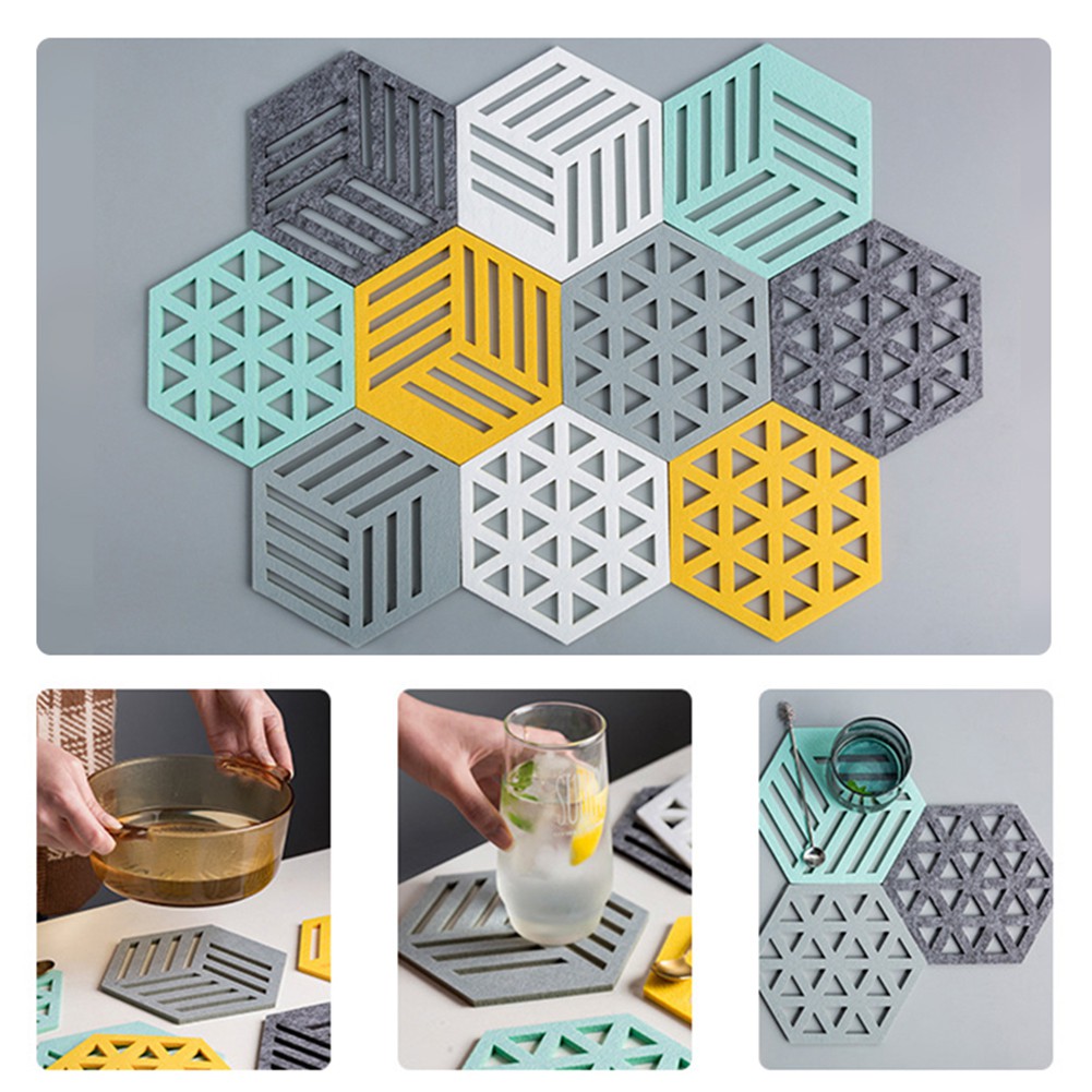 Features: Brand new and high quality. Creative felt mateiral cup coaster, suitable for autumn and winter seasons. Match to nordic or modern decoration well, also it's a great decoration on table. Felt material, soft touch feeling, feel warm, not like pu leather or silicone feeling. Hexagon shape, unique and symmetry shape, very fashionable. 2 kinds of hollow shape and 5 kinds of color for your choice. Specifications: Material: Felt Color: Blue, Gray, White, Green, Yellow Size: 15.5cm*17.5cm-6.1"*6.90" Hollow Shape: Triangle, Cross Strap Package Include: 1Pc x Cup CoasterNote: There could be some slight differences in the color tone of the pictures and the actual item. Please allow 1-2mm differs due to manual measurement, thanks.Package Included: 1Pc x Cup CoasterNo Retail Box. Packed Safely in Bubble