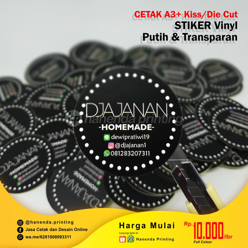 HARGA SUDAH TERMASUK KISS CUT (CUTTING SETENGAH PUTUS)Mengikuti Pola = Bulat, Oval, Rounded, dan Sesuai Pola Desain*MINIMAL PEMESANAN 5 LEMBAR*Cek Slide Produk untuk mengetahui Jumlah pcs / A3● Untuk Keamanan pengiriman barang dibawah 30 lembar"Packing Paper Core/Slongsong + Bubble Wrap"https://shopee.co.id/product/271398531/11910817786/● Deskripsi barang:1. mengunakan stiker quantac, Vinyl Mate (putih dof) dan Transparant (bening).2. ketebalan stiker kurang lebih 170 gram, memiliki daya rekat yg kuat & tidak mudah sobek.3. dicetak mengunakan tinta serbuk/toner, tidak mudah baret dan tahan air.● Pemesanan :1. File ready bisa dikirim langsung via email. hanenda.printing@gmail.com Format File, JPEG/EPS/AI/PDF/PSD/COREL, File Jpeg Minimal 300 Dpi, dan cantumkan : Nama File, Bahan, Ukuran, Bentuk Cutting, Jumlah Lembar2. pemesanan di proses setelah ACC pola cutting serta tambahan lainnya.3. File yg belum ready/tidak memiliki desain harap chat dan konsultasi terlebih dahulu.NOTE :- proses pengerjaan setelah acc selama 1-2 hari kerja. - untuk pengiriman paket yg berukuran A3+ yg sudah dipotong menjadi 2 bag