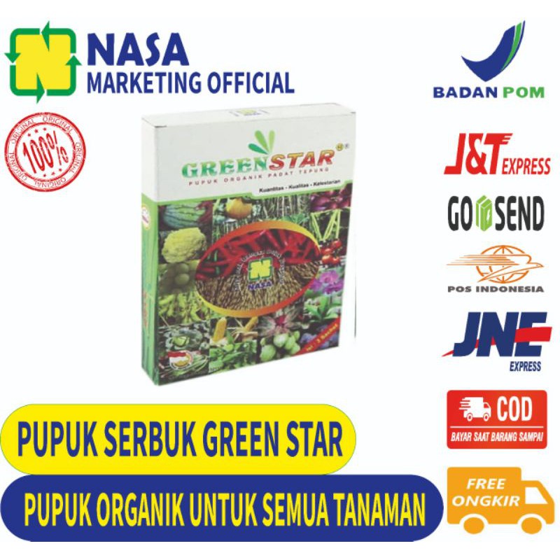 GREENSTAR merupakan terobosan teknologi modern dari PT Natural Nusantara yang menghasilkan pupuk organik berbentuk serbuk.Pupuk organik dari Nasa ini murni terbuat dari bahan – bahan alami berkualitas dan mengandung Unsur Hara Makro dan Mikro yang lengkap. Selain itu, Pupuk Organik Serbuk ini diperkaya juga dengan hormon Giberelin, Sitokinin & Auksin (zat pengatur tumbuh), enzim dan asam-asam organik.Kelebihan Pupuk Organik GREENSTAR-berguna untuk semua jenis tanaman pangan, buah dan palawija.-dapat di aplikasikan pada tanaman semusim, tahunan, tanaman hias & juga pembibitan.-dapat meningkatkan produktivitas secara kuantitas & kualitas dengan tetap manjaga kelestarian lingkungan/tanah (Aspek K-3)-dikemas unik, aplikasi lebih praktis & super ekonomis & didalamnya berisi 3 sachet dengan hasil panen melimpah.-Serbuk GREENSTAR sudah terdiri dari POC Nasa dan Hormonik sehingga lebih mudah dan praktis.-Dengan menggunakan GREENSTAR, Pupuk Makro (NPK) bisa diKurangi
