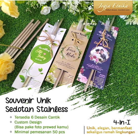 SELAMAT DATANG DI TOKO KAMI : JOGJA ETNIKAProduk yg lagi 'in'.. sedotan stainless dikemas dalam bentuk souvenir yang lucu dengan desain yg cantiks..;).Spesifikasi Produk :****** Sedotan Stainless Steel (Besi) panjang 22 cm, diamater 0.4 cm.****** Sikat Stainless Steel dengan ujung lembut. (Utk yg order + sikatnya)****** Packaging ukuran : 17x 15.5 cm.****** FREE KEMASAN PLASTIK JIKA MENGINGINKANYA.****** Bisa request desain sesuai yang kamu mau.. hanya saja waktunya lbh lama yaa kak coz hrs melalui proses desain terlebih dahulu. Mohon dchat dl.****** Pemesanan minimal 50 pcs, maksimal sebanyak2nya..;)..Silakan diorder yaa kakak. Bikin beda dan unik pernikahan kamu dengan souvenir cantik ini. Pasti deh banyak yg sukaaaa...:))))Maturnuwun#sedotan #sedotanstainless #sedotanbambu #souvenirpernikahan #undanganpernikahan #bukutamu #kartuucapanterimakasih #mahar #tempatcincin #kotakcincin #ringbearer #pernikahan #souveniru