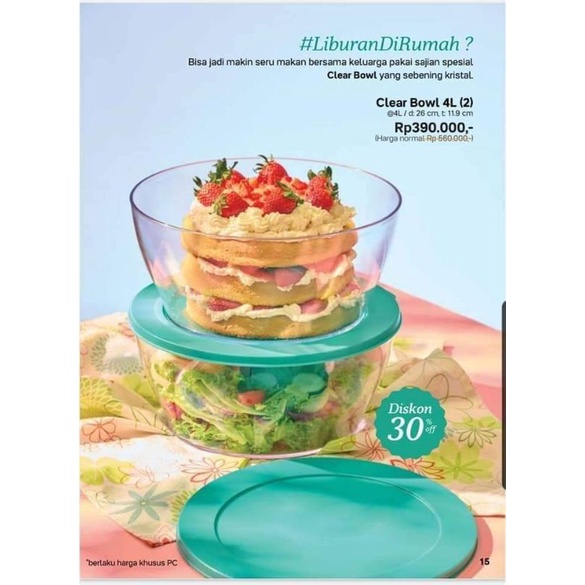 Clear Bowl, sajian sebening kristal. Hidangan semakin terlihat segar dan nikmatnya Ukuran@4L / d: 26 cm, t: 11.9 cmFiturWadah saji bowl dengan material khusus yang sebening kristal. Berkapasitas 4L.Wadah sajian yang juga mudah dibersihkan dan tidak mudah meninggalkan noda makanan. lengkap dengan seal yang ketat u