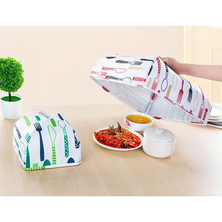 Nama: Tudung Saji Lipat Cover Penutup Makanan Lipat Penahan Panas PraktisBahan: Aluminium FoilSize: 37 x 37 x 15 cmMotif/Warna: motif sendok garpu warna Hijau== TUDUNG LIPAT INI TIDAK ADA RANGKA/TULANG PENYANGGANYA ===* Tudung saji ini bagian dalamnya terdapat lapisan penahan panas/dingin, fungsinya untuk menahan panas makanan agar awet, tidak mudah jadi dingin. Lauk yang dimakan dalam kondisi panas atau hangat akan terasa lebih nikmat* Selain untuk menahan panas makanan, tudung saji juga berfungsi untuk melindungi makanan dari debu dan serangga, lebih higienis tentunya* Tudung saji bagian luar terbuat dari bahan kain anti air, bahan cukup tebal, dalamnya ada lapisan penahan panas/dingin.* Tudung saji bisa dilipat jika sedang tidak dipakai, memudahkan disimpan dan tidak boros te